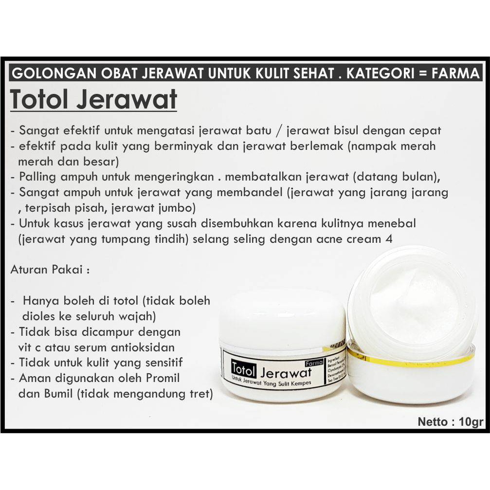Ketika jerawat mengganggu, kamu bisa atasi dengan menggunakan obat totol jerawat, loh. Berbeda dengan obat totol jerawat dengan merk benzolac. Obat totol jerawat ini terbilang ampuh untuk menghilangkan jerawat membandel. Totol / oleskan pada bagian jerawat, pagi & malam hari.