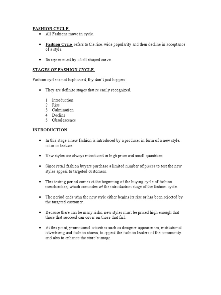 Fashion cycle. Fashion cycle a period of time or life span during which the fashion exists moving through the five stages from introduction through obsolescence. Even so the fashion cycle is usually depicted as a bell shaped curve encompassing five stages. Fashion cycle classic cycle fad cycle fashion leaders fashion theories 3.